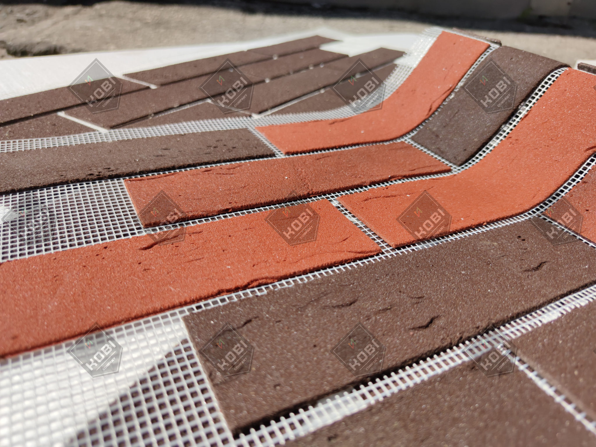 Гибкий кирпич на сетке представляет собой модуль, состоящий из фасадной штукатурной сетки, на которую наклеены кирпичи. Поэтому такие панели очень удобно монтировать при больших площадях. Сам кирпич аналогичен штучному. Кирпичи нанесены на фасадную сетку плотность 160 г/кв. метр. Каждый кирпич имеет защитную пленку, которая защищает лицевую сторону кирпича и снимается после расшивки швов. Размел одной панели — 0,6 кв. метра (1000 x 600 mm). Монтаж осуществляется на качественный клей для плитки.